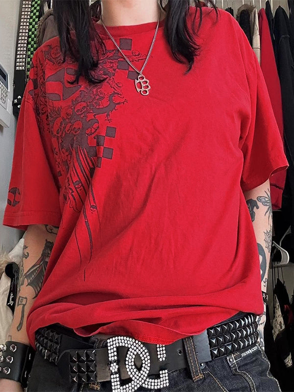 Red Hip Pop Oversized Skull Print Short Sleeve Tee