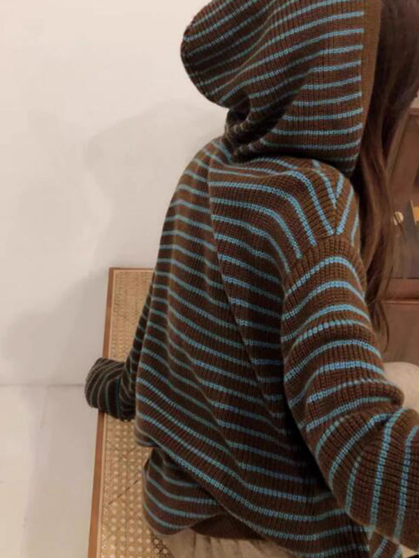 Vintage Coffee Color Hooded Stripe Lace Up Sweater