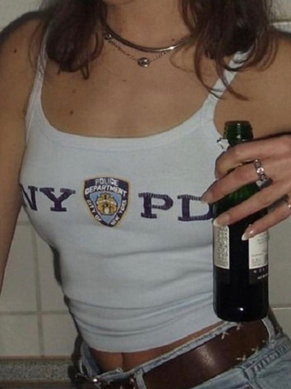 White Vintage Letter Print Embroidery U Neck Tank Top