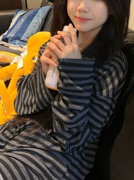 Black Vintage Striped Round Neck Long Sleeve Top