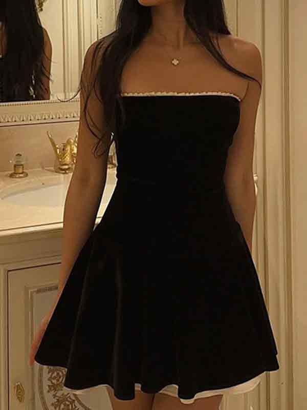 Black Vintage Velvet Splice Pleated Bandeau Mini Dress