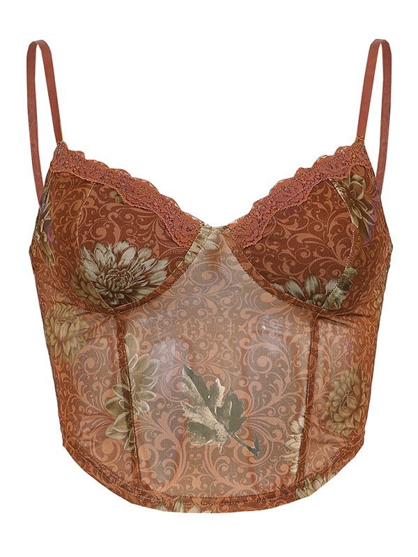 Description: Lace trim, open back, all-over print, asymmetric waistband