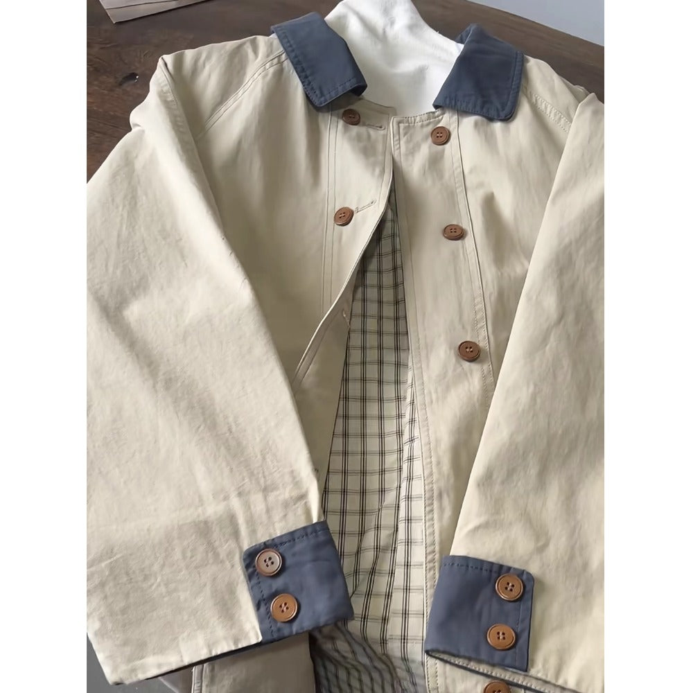 Classic Contrast Design: Beige body with dark collar and cuff accents for a modern touch.