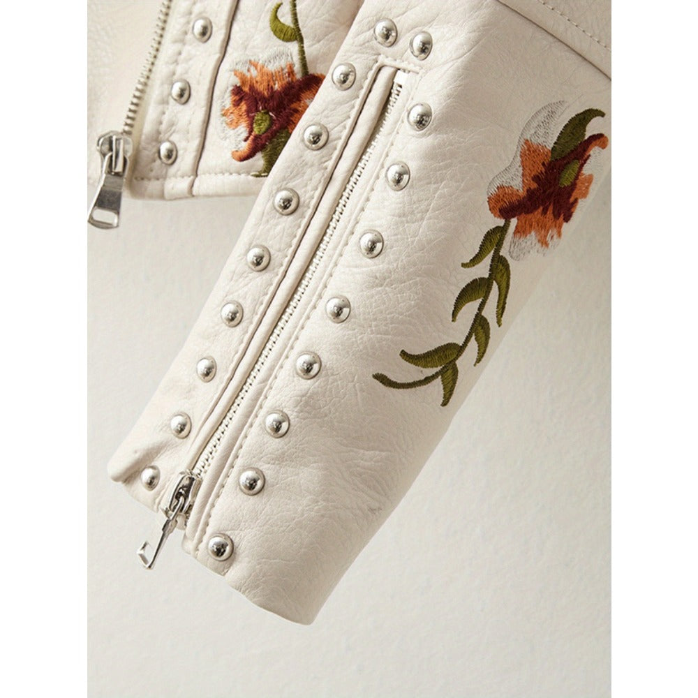This beige faux leather jacket combines a modern biker silhouette with delicate floral embroidery for a fresh and stylish twist. Designed for women who appreciate statement outerwear, it offers both structure and charm, making it an easy choice for layering over a variety of outfits.
