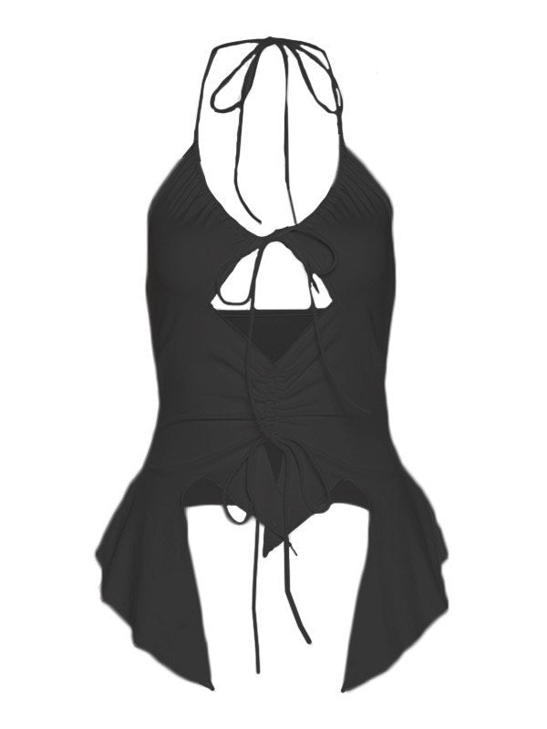 Design: Drawstring Tie Strap Detail, Irregular Hemline, Cutout At Front