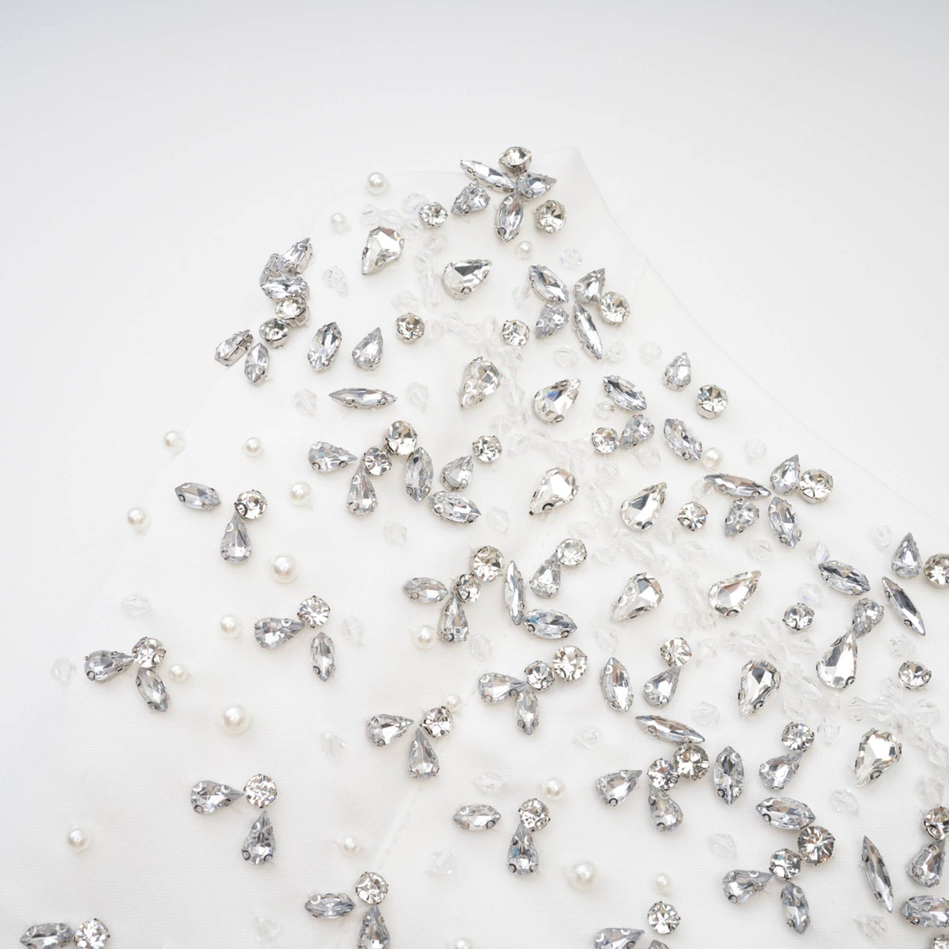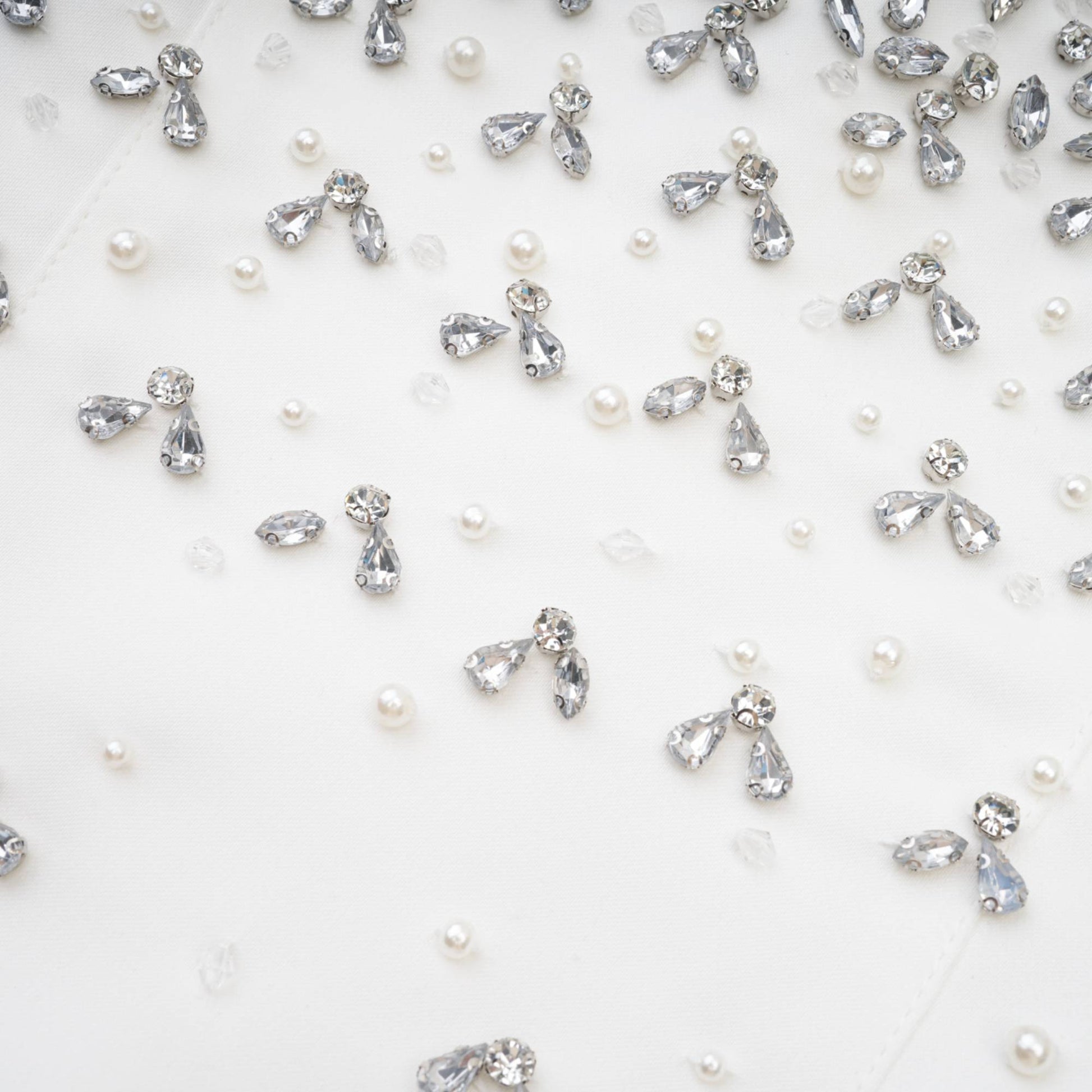 Fully adorned with delicate, hand-applied pearls and crystals for maximum impact