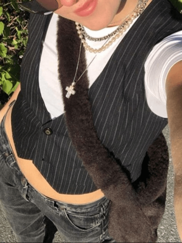 Descriptio: Step up your style game with this trendy black pinstriped corset top. Its slim fit and V neck add a touch of sophistication, while the sleeveless design keeps you cool and comfortable. Made from a blend of cotton and spandex, it offers a perfect balance of comfort and stretch. Whether you're going for a casual or street look, this corset top is sure to make heads turn.