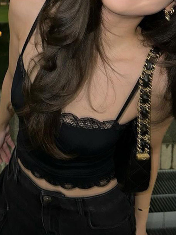 Black Vintage Lace Paneling Black Slim Fit Cami Top