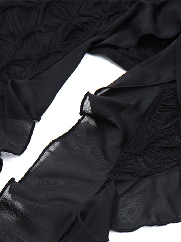 Black Vintage Tie Front Ruffles Flower Trim Long Sleeves Blouse