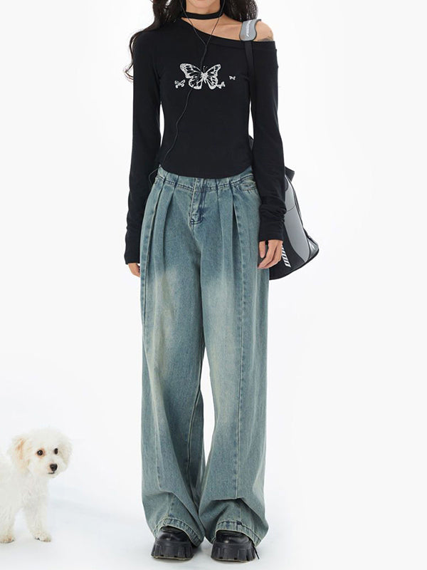 Black Y2K Butterfly Print Slanted Shoulder Long Sleeve Top