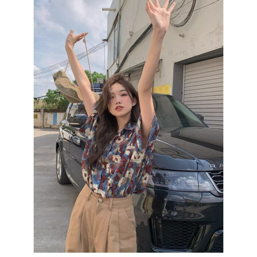 Blue Floral Print Button Up Shirt for Women - Sabina