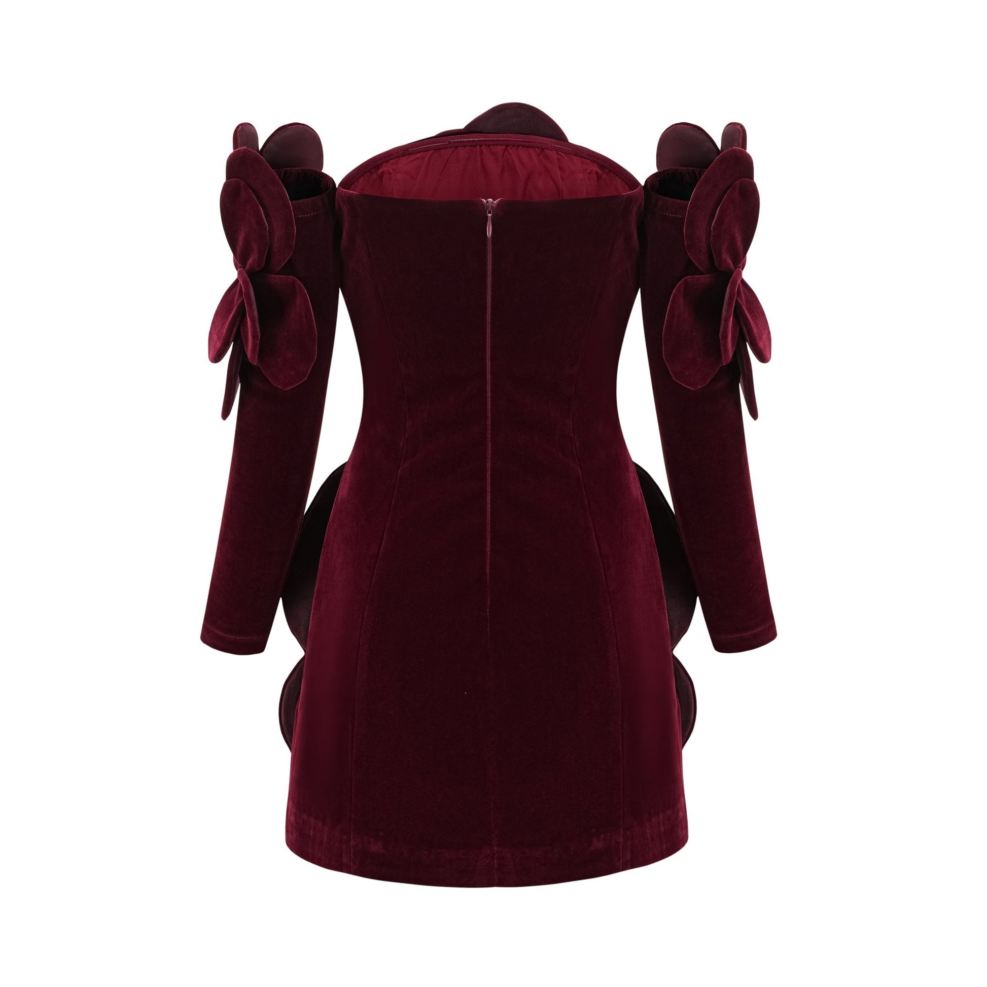 This red velvet mini dress offers a bold, feminine look with its off-the-shoulder design and intricate floral appliqué. Crafted from soft velvet, it features a flattering thigh-length silhouette with long sleeves, making it a perfect statement piece for your wardrobe.
