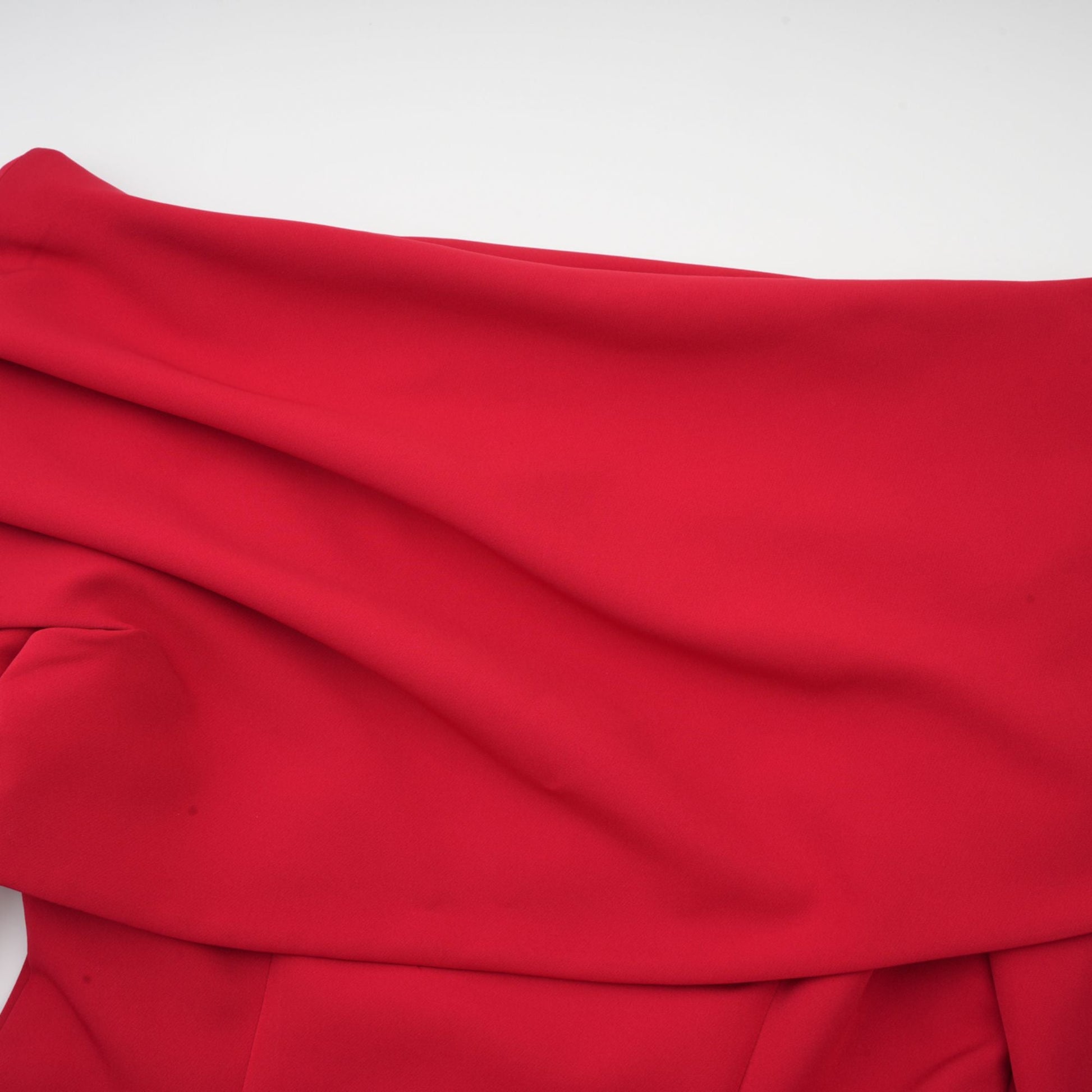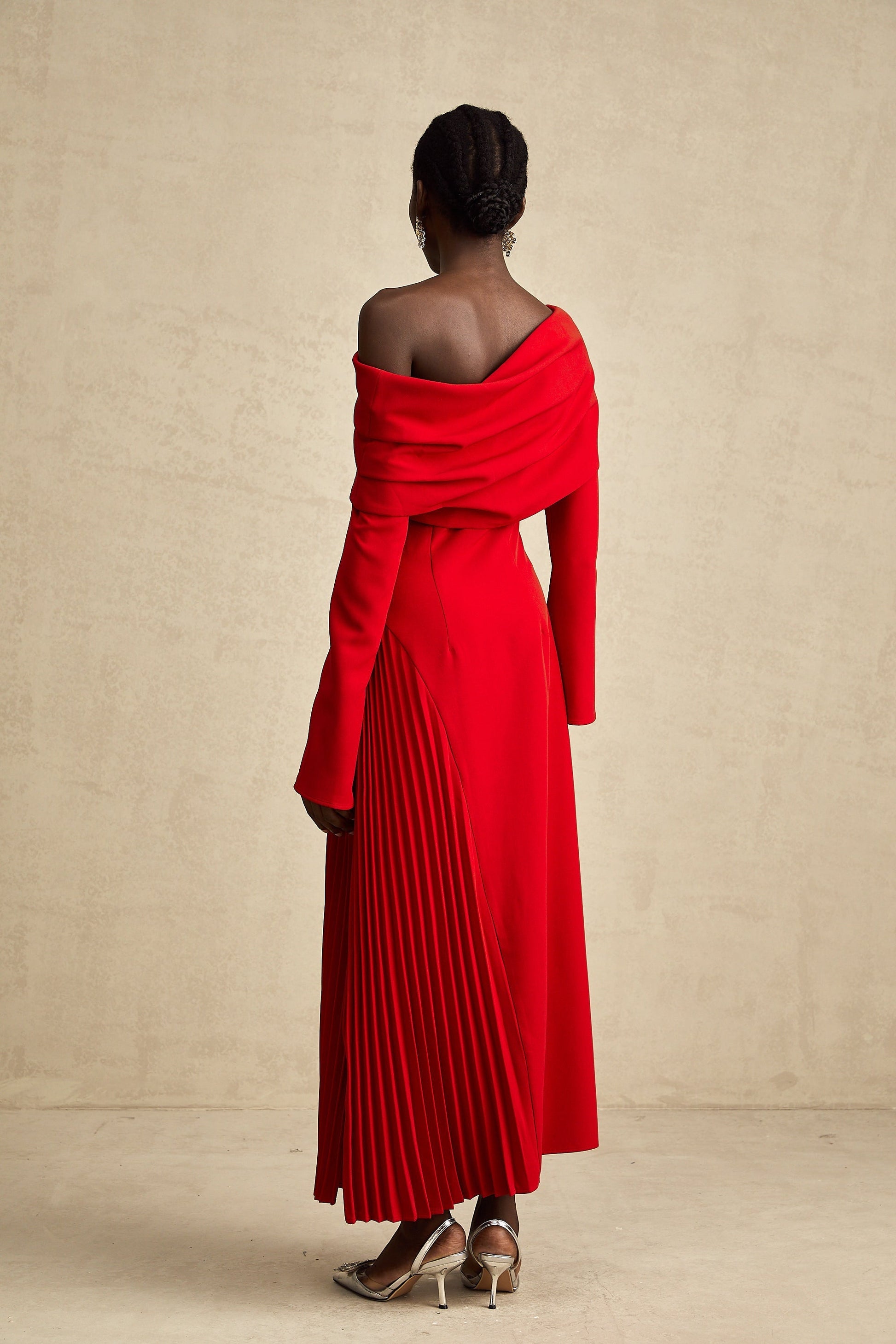 Turn heads with this striking red maxi dress, designed to combine sculptural structure with fluid movement. The asymmetrical neckline and pleated accents offer a bold silhouette that exudes modern sophistication.