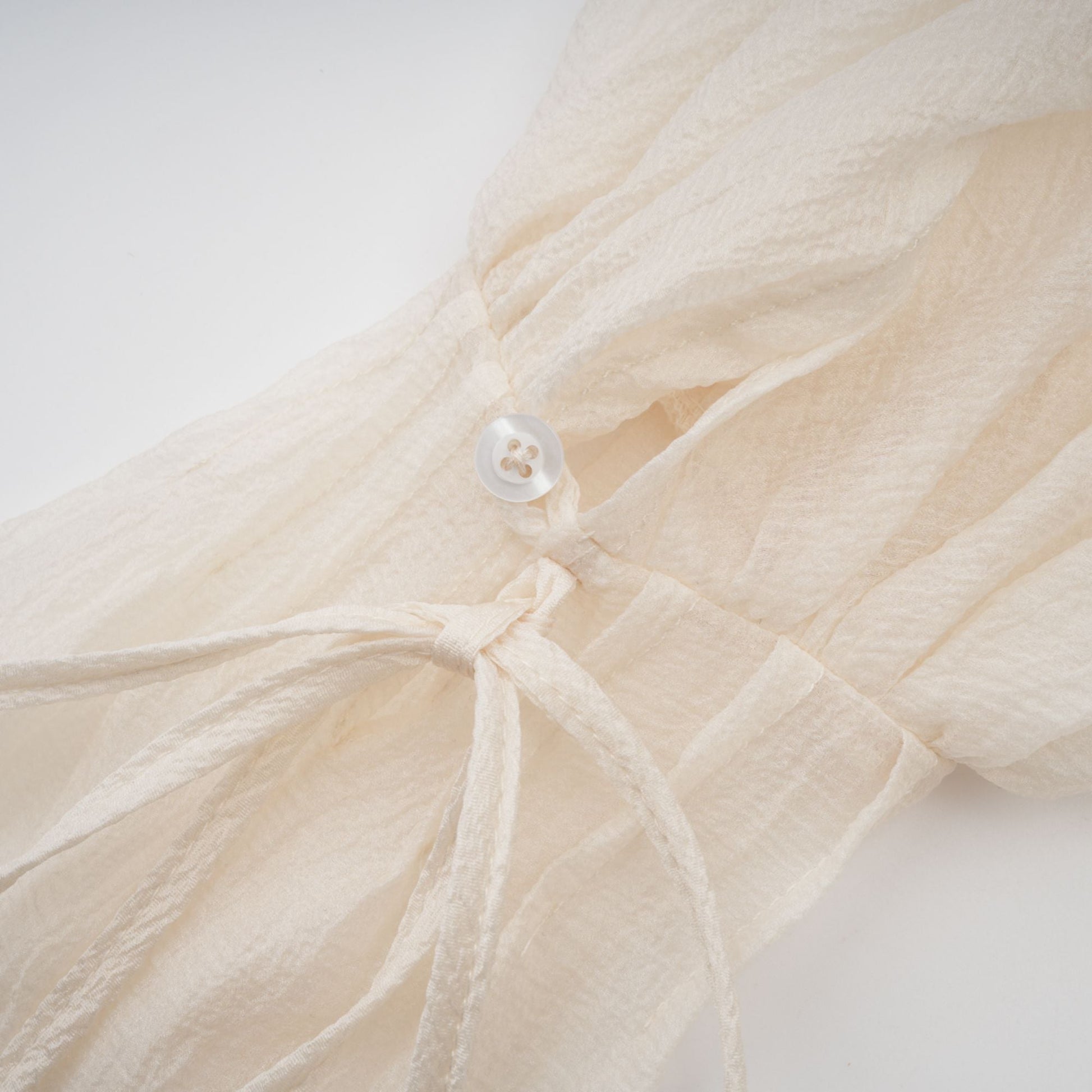 This dress combines delicate floral appliqué with a semi-sheer design, creating a chic and romantic style. The neutral tones and tiered skirt give it a playful yet sophisticated appeal.