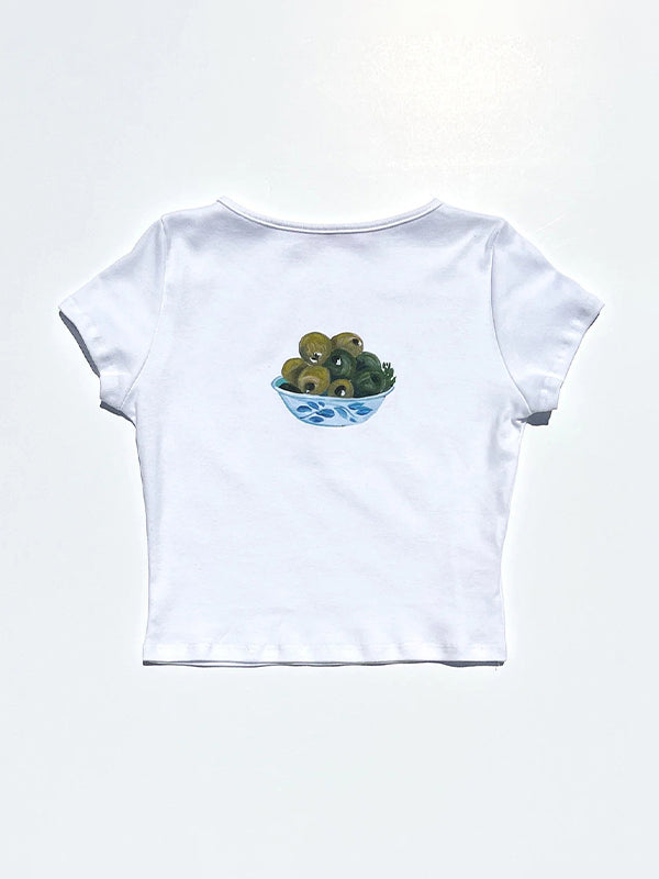 Playful Print: Add a touch of whimsy to your wardrobe with this Fruit Print Crew Neck Short Sleeve Tee. Featuring a vibrant and fun fruit print scattered across the fabric, this tee is sure to bring a smile to your face and brighten up any outfit.