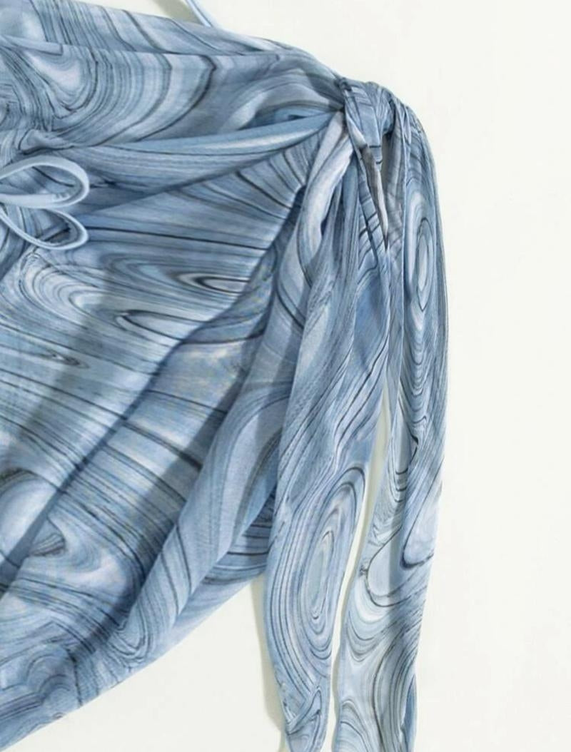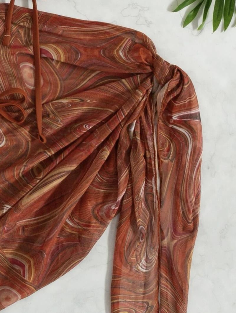 Description: Be the star on the beach with this micro swimming costume! The cross-over halter bikini top has padded cups and adjustable tie straps. The brief sits high, as does the waist tie and matching sarong skirt with swirl design. Available in 6 different colours, have fun!