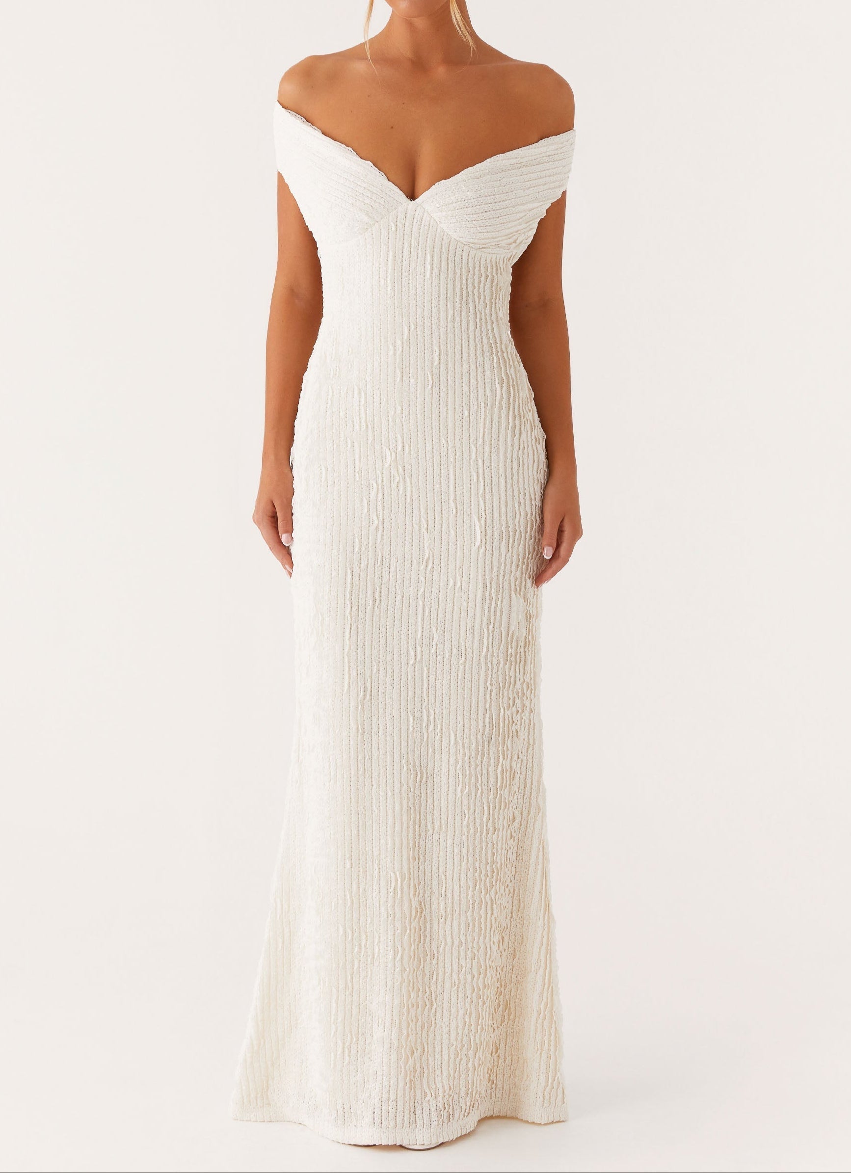 Embrace timeless femininity in this elegant maxi dress designed for effortless grace and sophistication. The romantic off-shoulder neckline and ruched underbust detailing create a flattering silhouette that moves beautifully with you, perfect for sunset soirées or special occasions.
