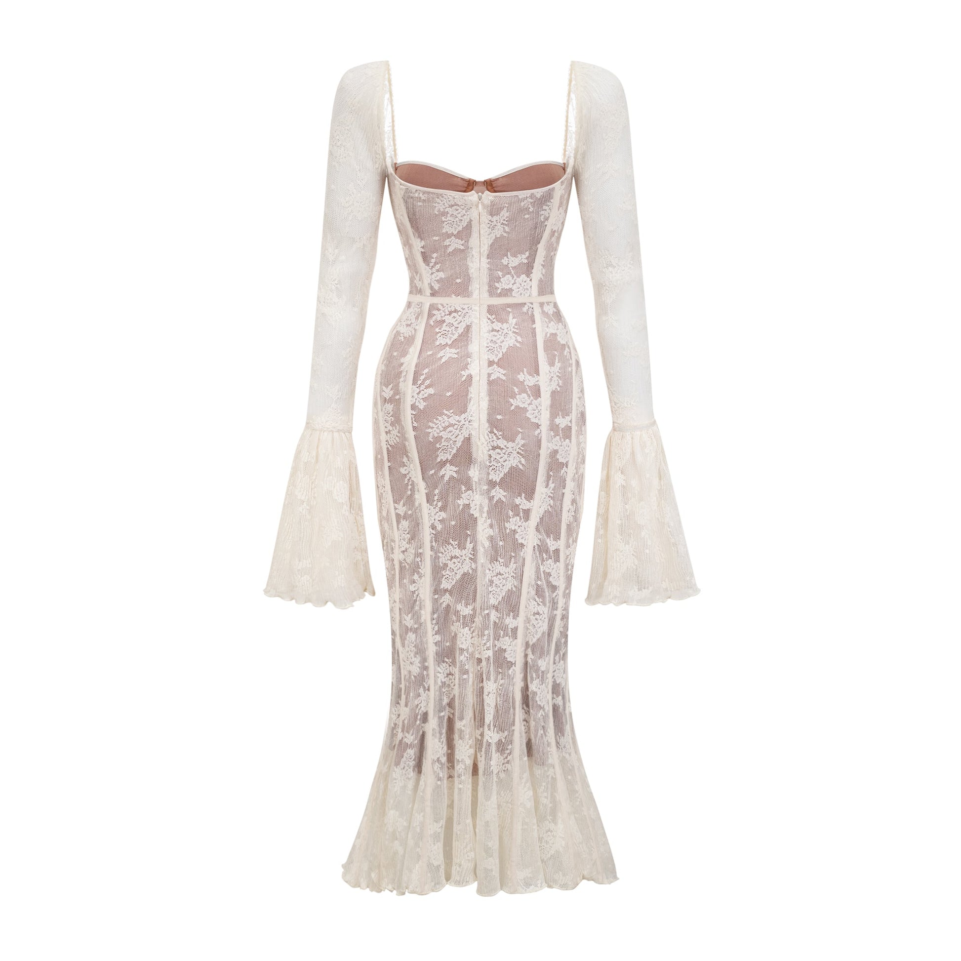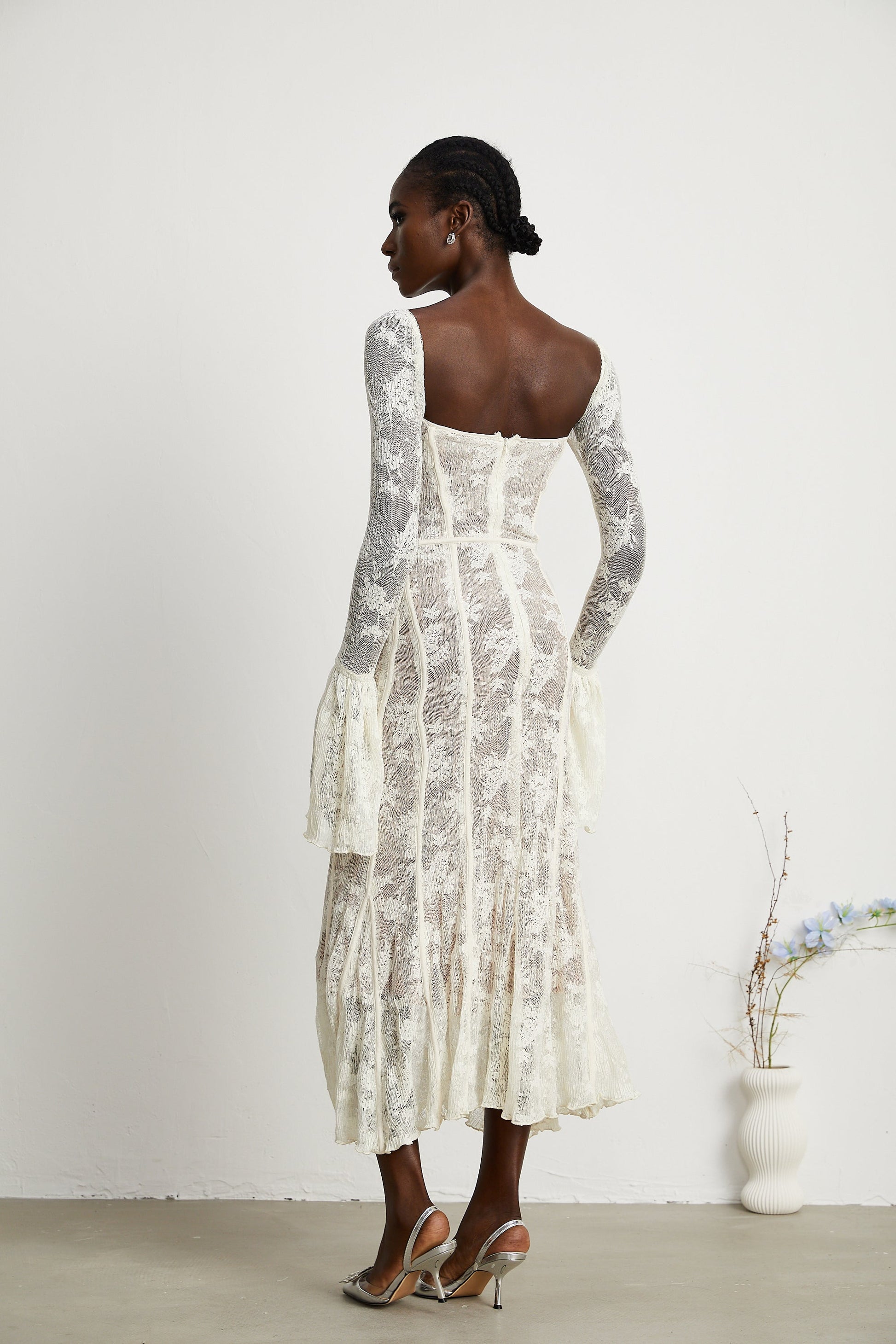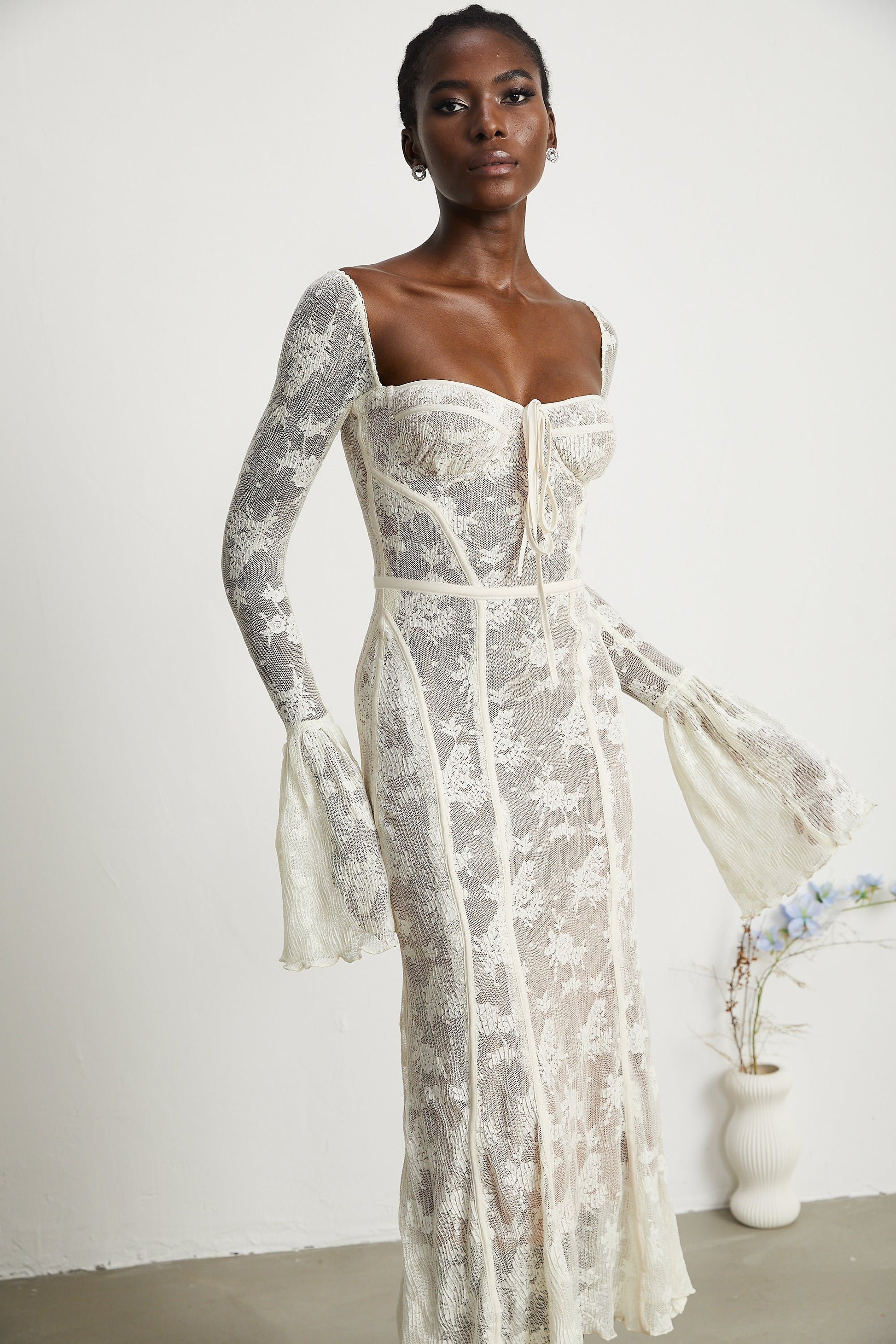 Ivory Lace Maxi Dress with Flared Sleeves for Women - Camilla