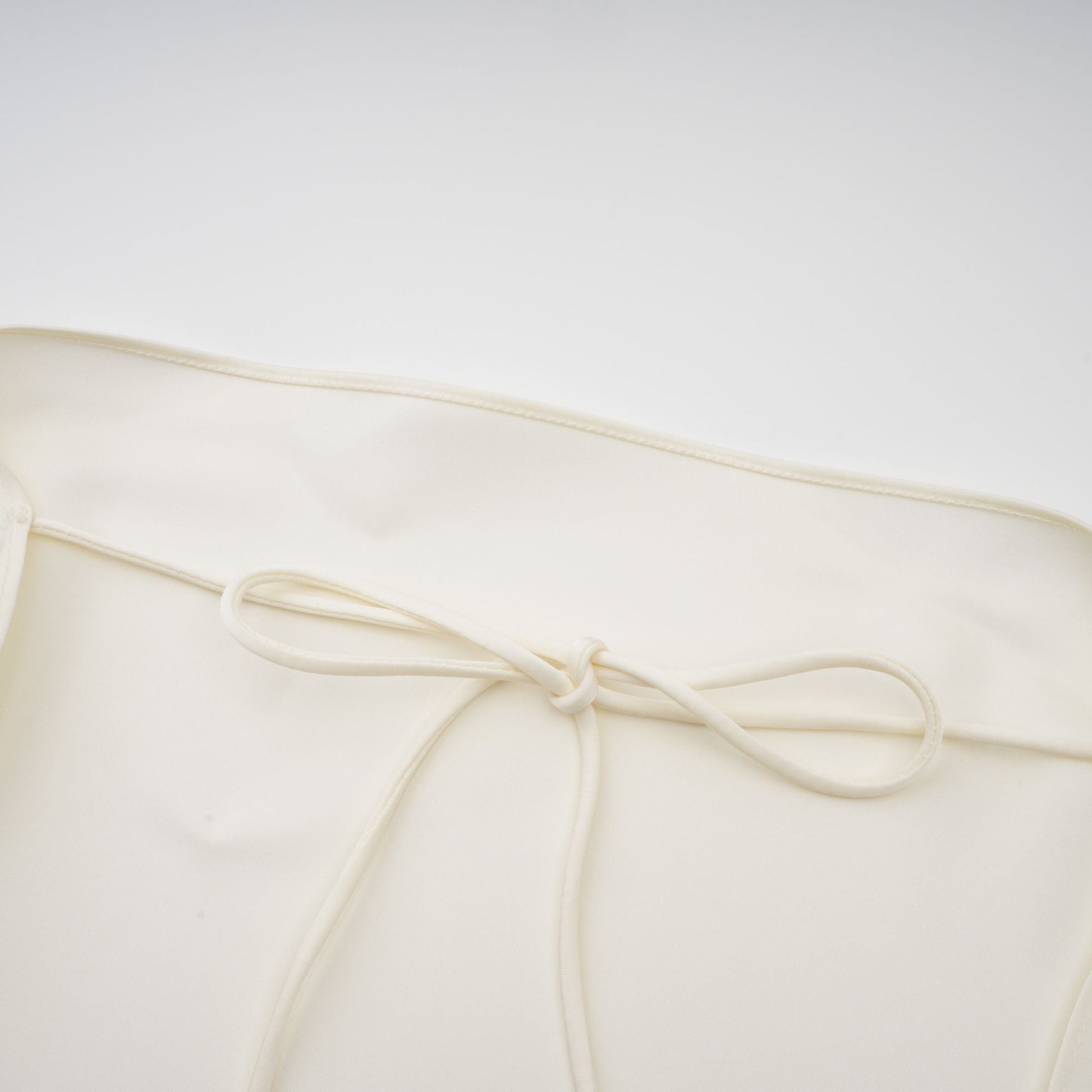 Turn heads with this white mini dress that combines delicate detailing and a modern silhouette. The smooth satin finish and ruffled layering create movement and dimension, while the open back and tie panel offer a bold, sculptural twist.