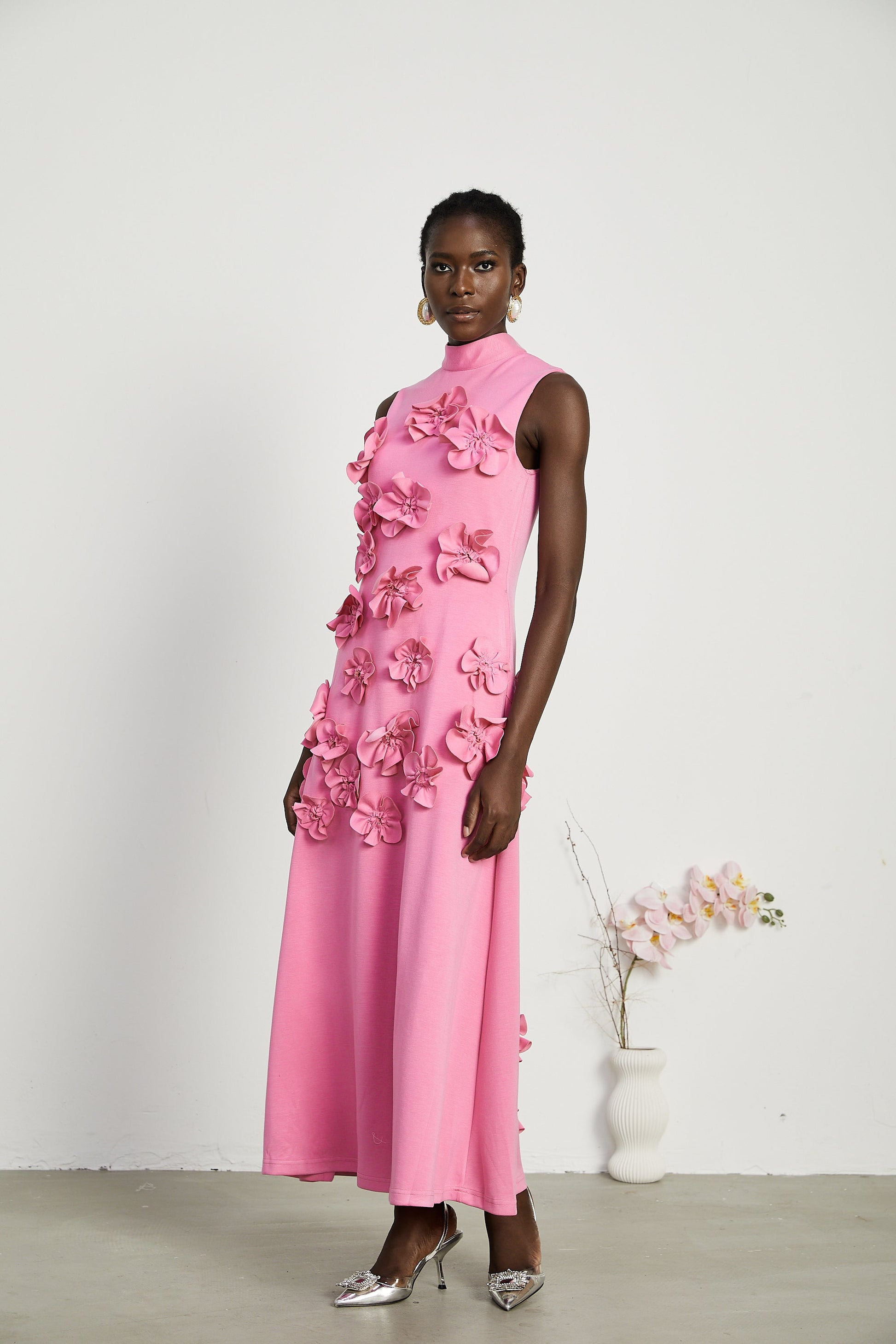 Pink Maxi Dress with 3D Floral Appliqué for Women - Viola