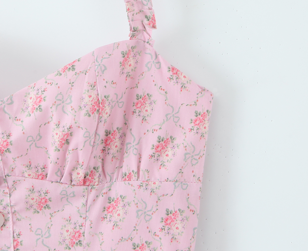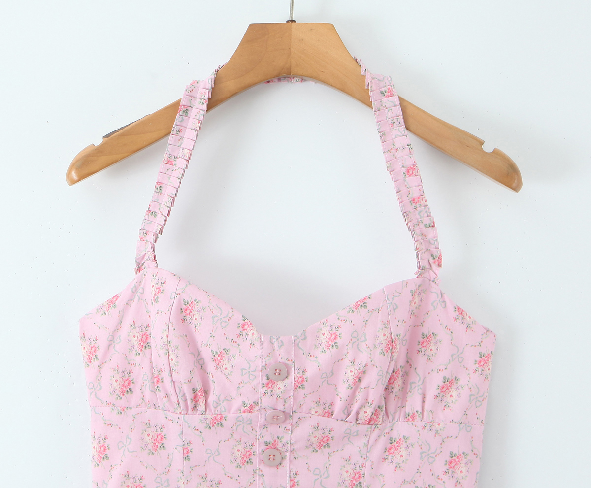 Romantic Sweet Pink Floral Sexy Slimming Beam Waist Backless Halter Dress