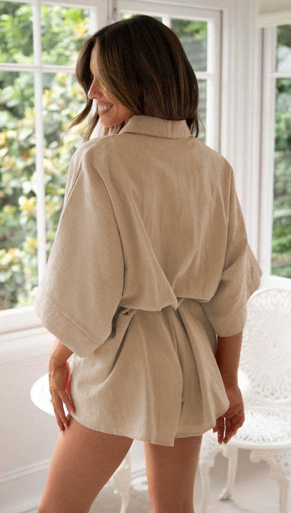 Summer Polo Collar Mid Sleeve Waist Lace up Loose Romper