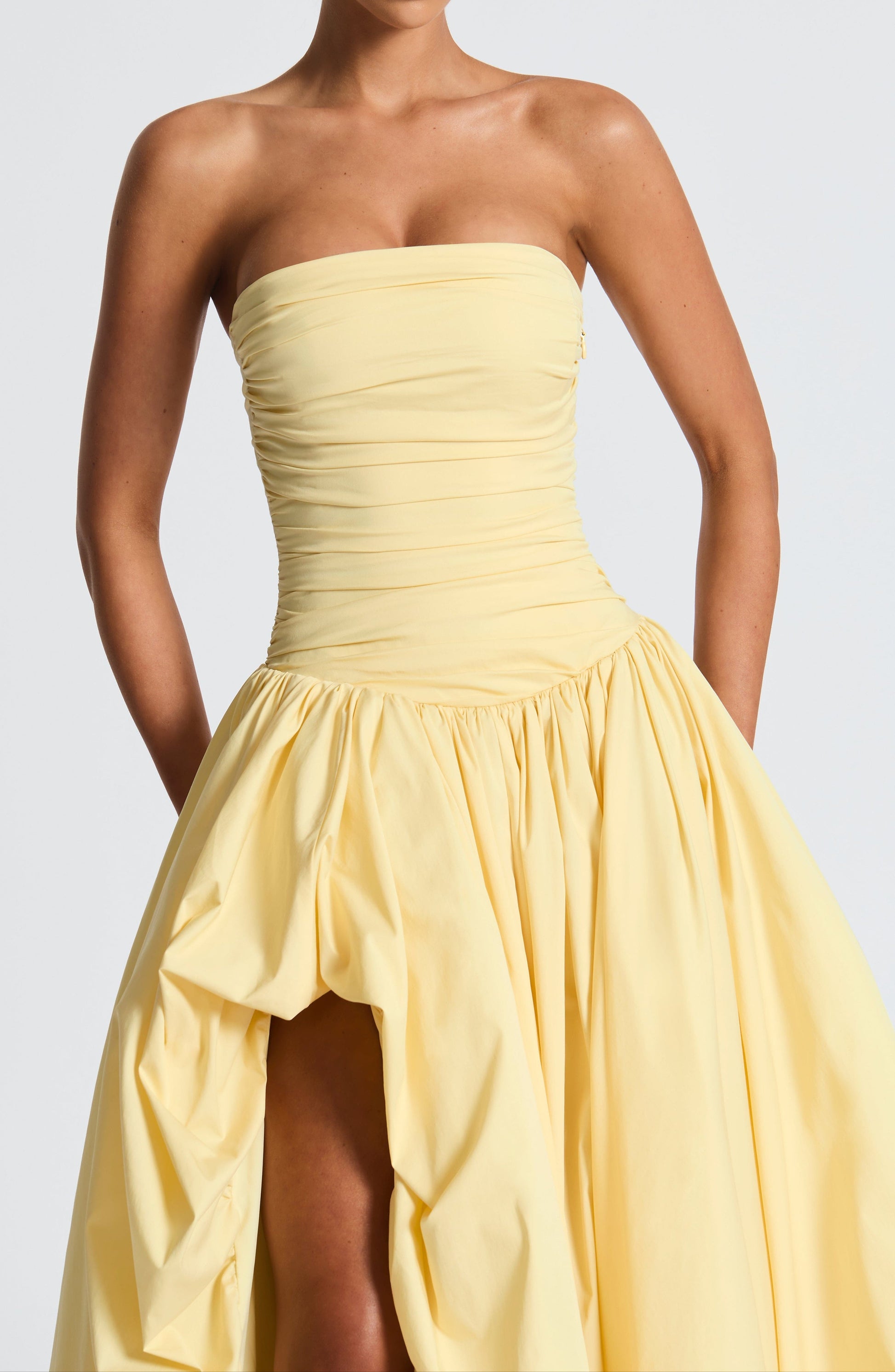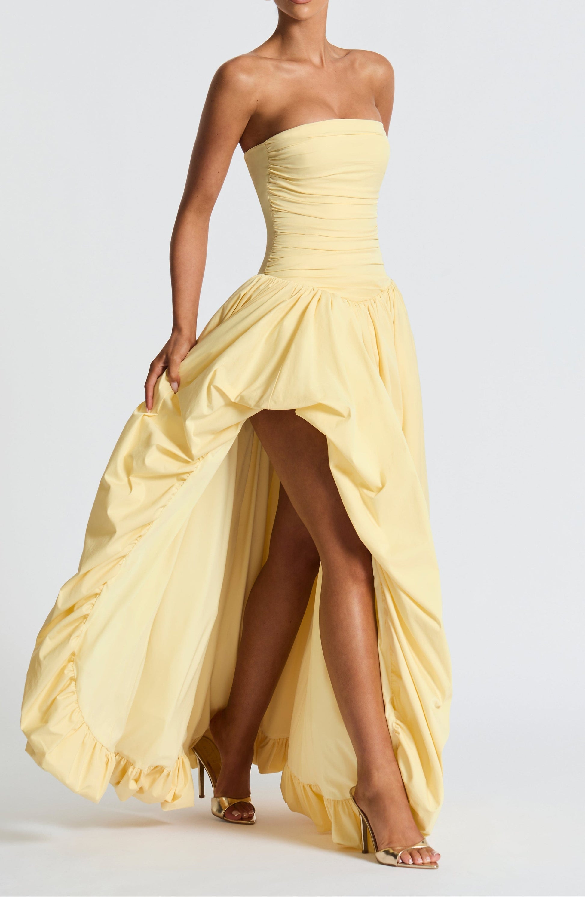 Elegant & Sophpticated Design – The Maxi Dress in Lemon exudes timeless luxury with its dramatic maxi length, strapless neckline, and a beautifully ruched bodice. The dropped waist and lace-up back panel add a touch of allure, while the puff ball skirt and thigh-high split create a striking, fashion-forward silhouette—perfect for weddings, galas, or any special occasion.