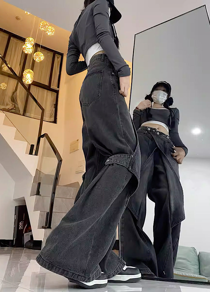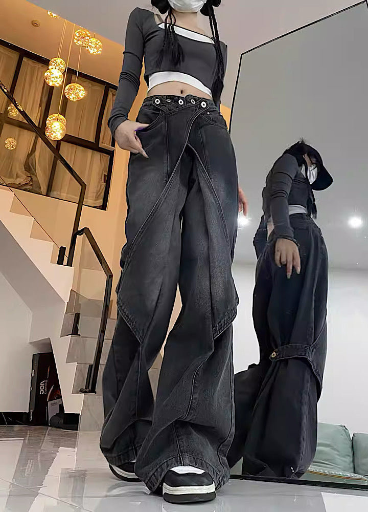 Unique denim pants with crossed fabric.