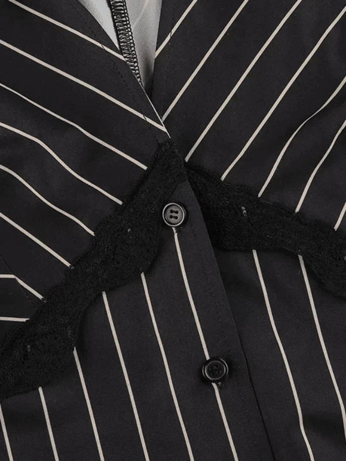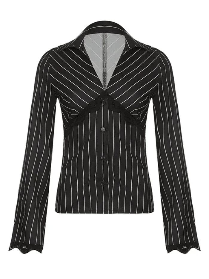 Delicate Lace Accents: The lace detailing adds a touch of femininity and romance to this long sleeve blouse. The intricate lace along the sleeves or neckline creates a captivating contrast against the striped fabric, elevating the overall aesthetic.
