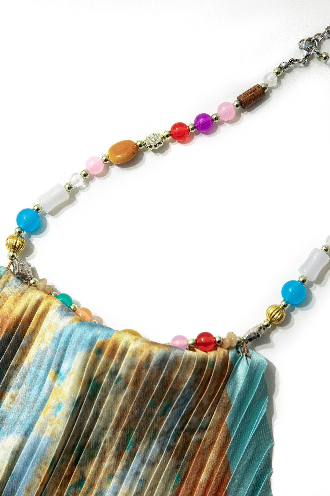 Vintage Oil Painting Print Pleated Beaded Halter Cami Top with Tie Up Back