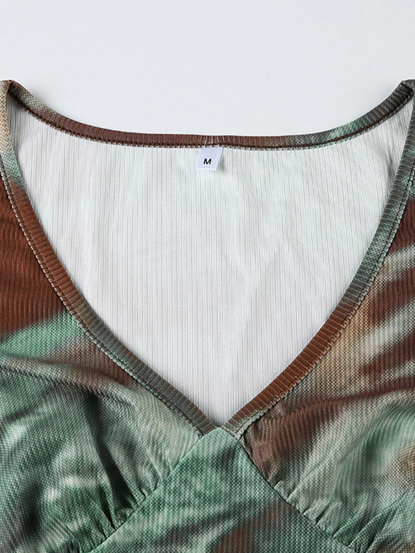 Vintage Oil Print Short Sleeve Tee with deep V-Neck