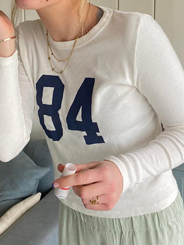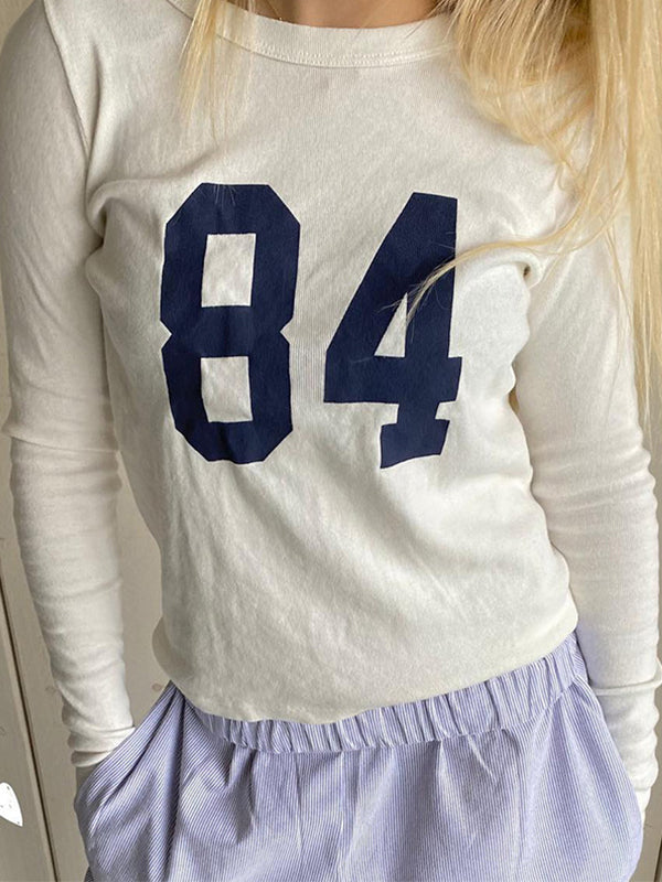 White Retro Digital Printed Crew Neck Long Sleeve Tee