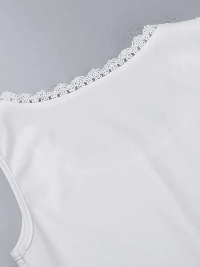 White Vintage Button Front Tank Top with Lace Trim