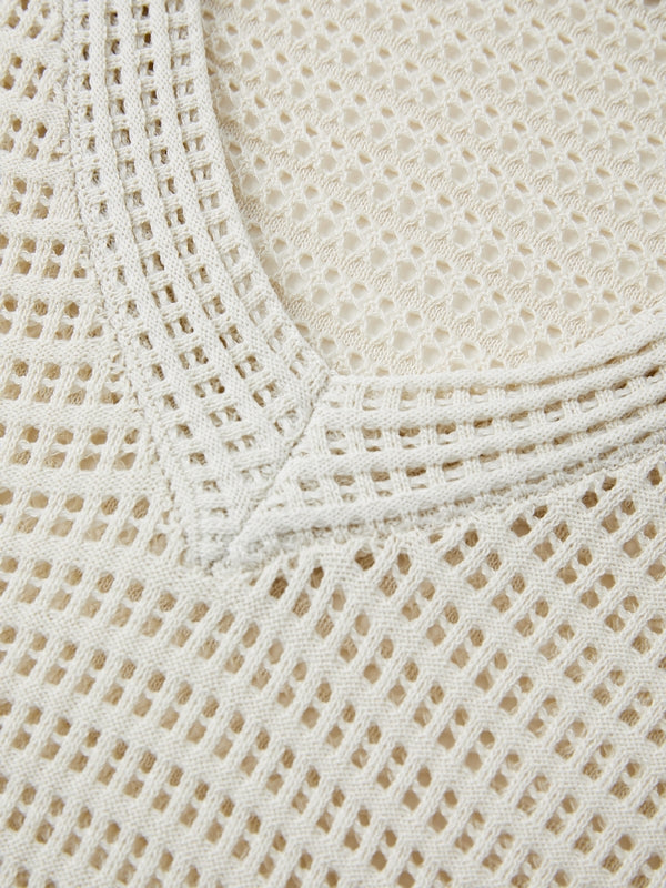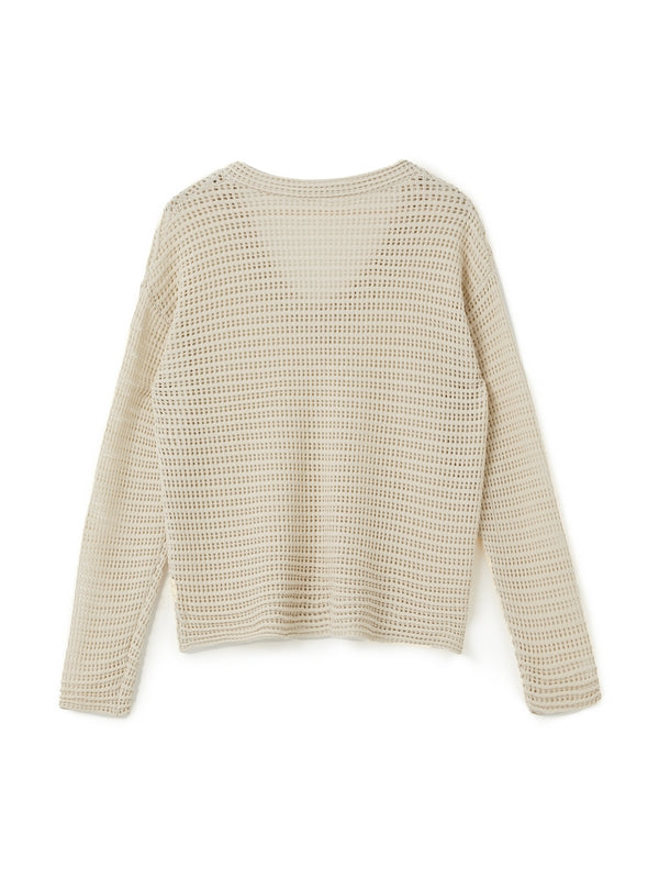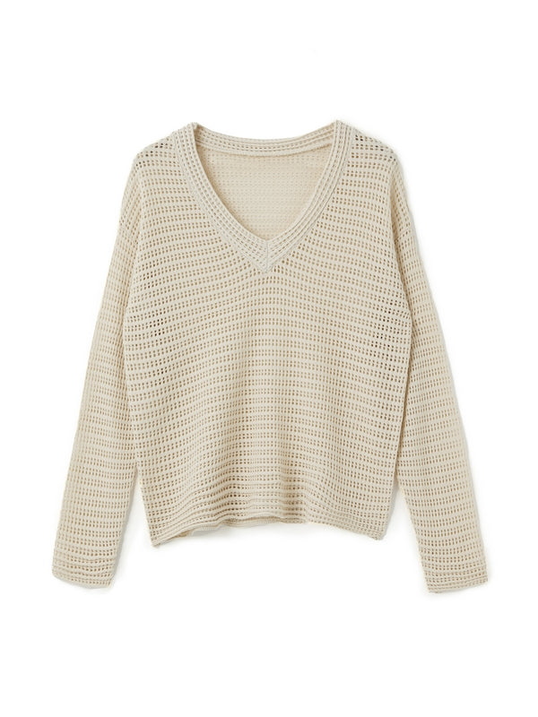 White Vintage Cutout Loose Long Sleeve Knit with V Neck