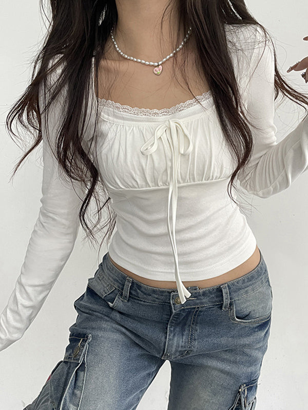 White Vintage Lace Trim Long Sleeve Tee with Tie Up