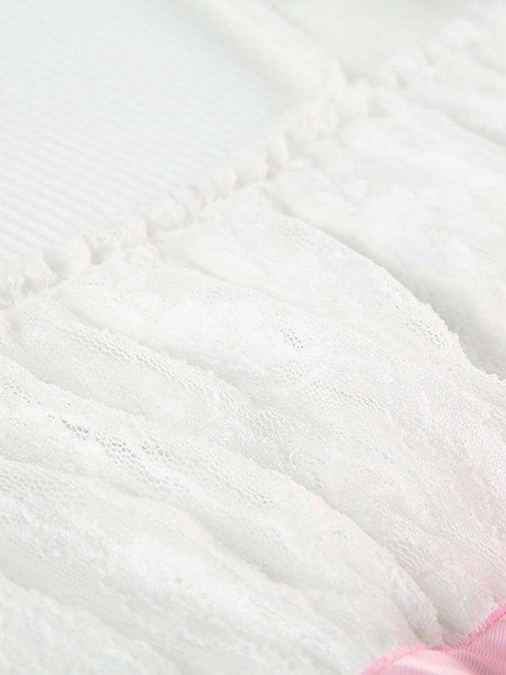 White Y2K Bow Lace Patchwork Bubble Sleeve Top